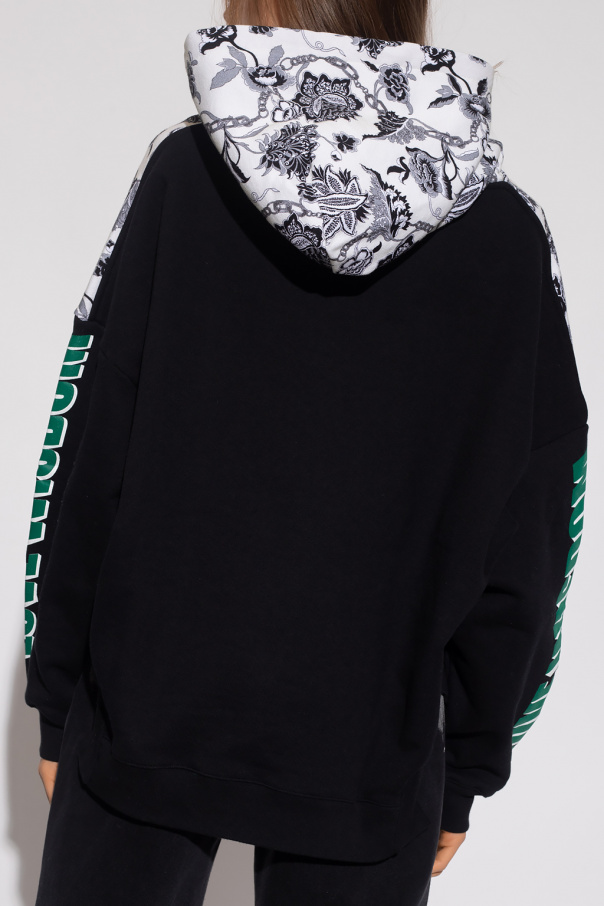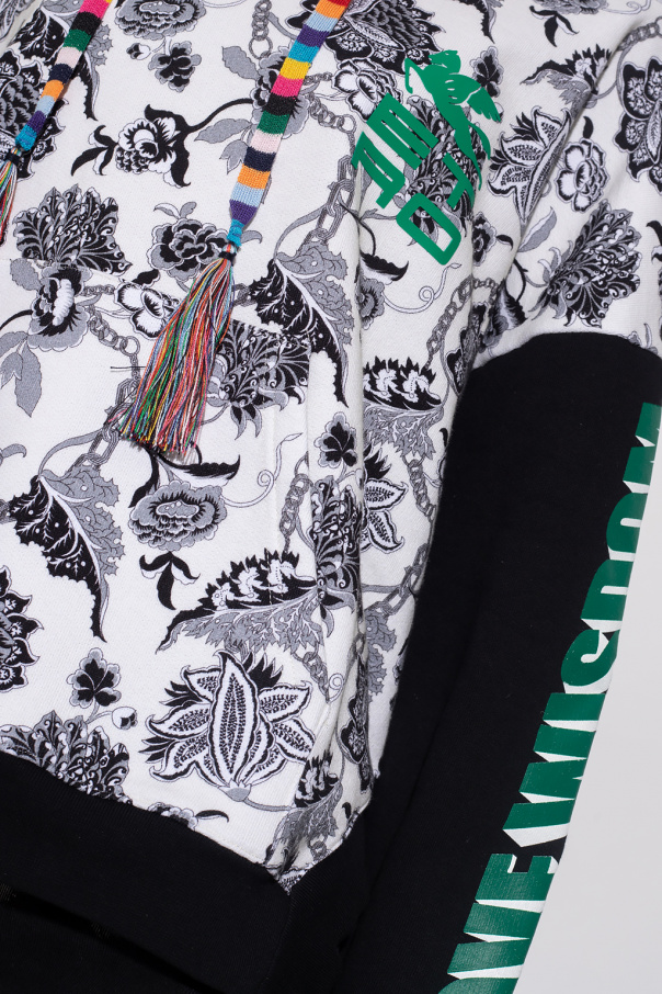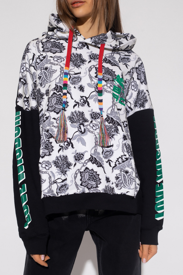 Cream and black hoodie from Etro. Crafted from cotton jersey with an oversize silhouette, this style showcases a black, grey and white floral print, a green rubber ‘ETRO CUBE’ logo patch, decorative colourful fringes on the hood, a kangaroo pocket, white and green printed lettering on the sleeves and elasticized trims on the edges.