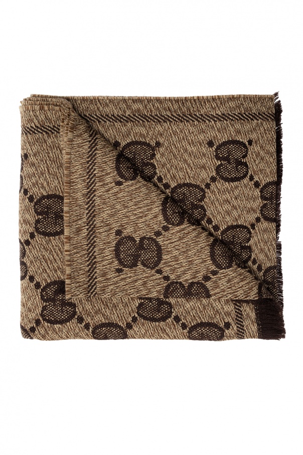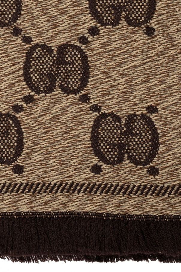 Brown scarf from Gucci. Crafted from wool, this item comes enriched with fringes and an embroidered logo pattern.