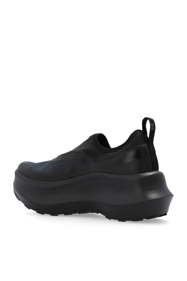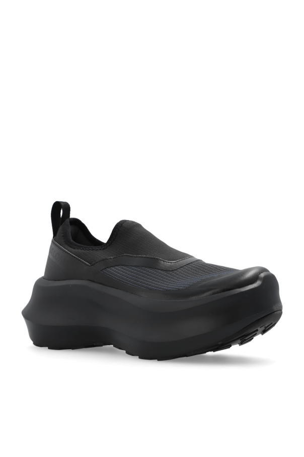 Black platform sneakers from Comme des Garcons x Salomon. Made from a synthetic material and TPU panels, this pair sits on a black CONTAGRIP® rubber sole and is decorated with a logo.
