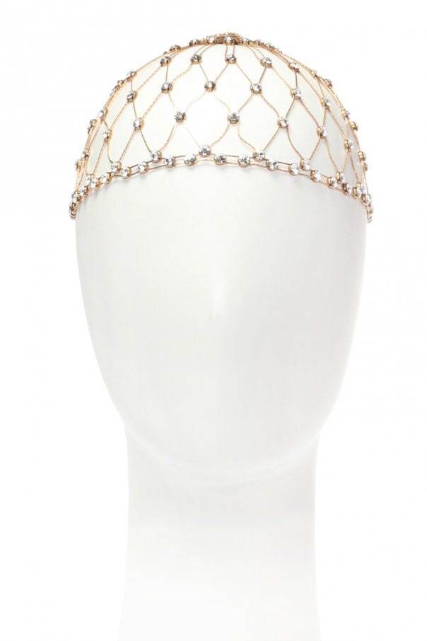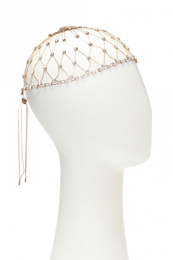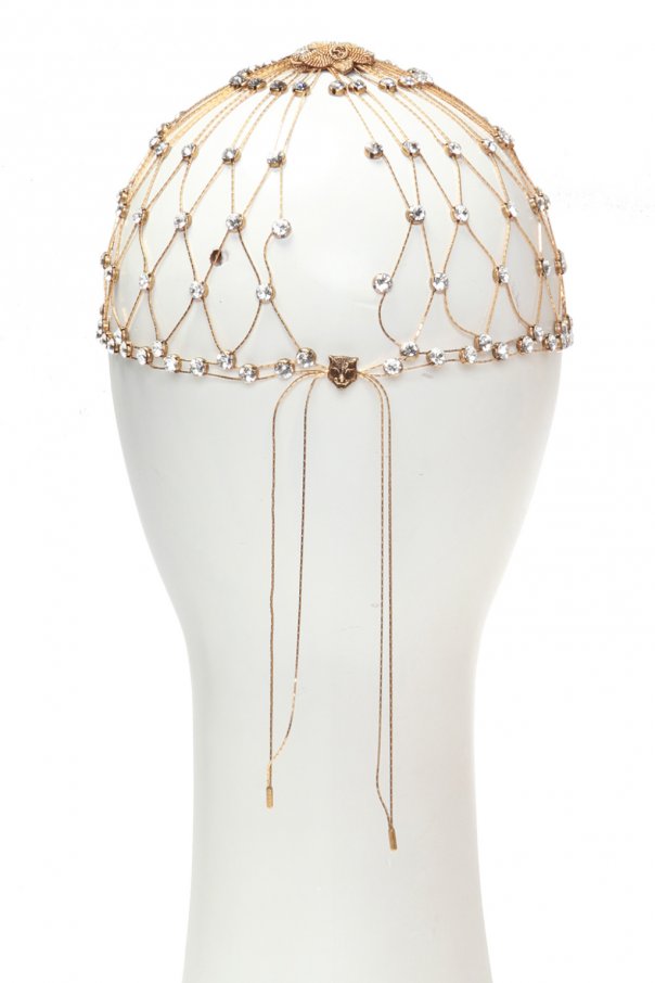 Antiqued gold-tone hair accessory from Gucci. Encrusted with decorative elements in white. Applique featuring the brand’s signature tiger head motif at the back.