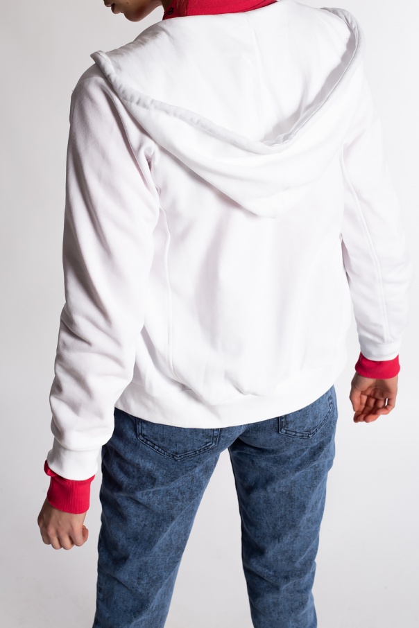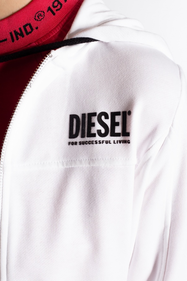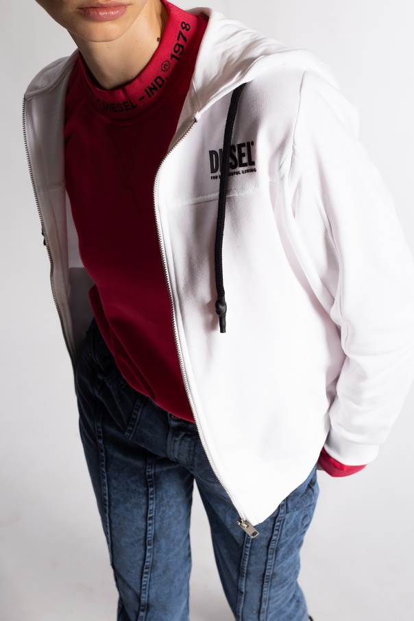 White hoodie from Diesel. Made of cotton, this long-sleeved design features a zip fastening, printed logo pattern in black, two slip pockets, drawstring hood and ribbed trims at the hem and cuffs.