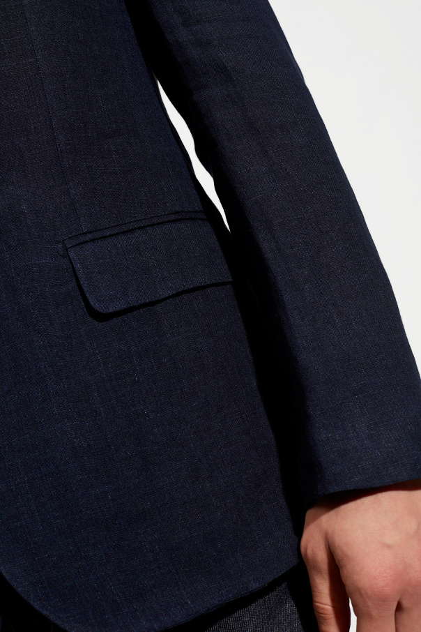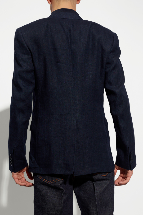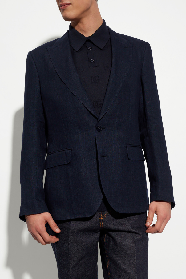 Navy blazer from Dolce & Gabbana. Made from a linen and cotton blend, this design features buttons, peak lapels, two flap pockets, single rear vent and long sleeves.
