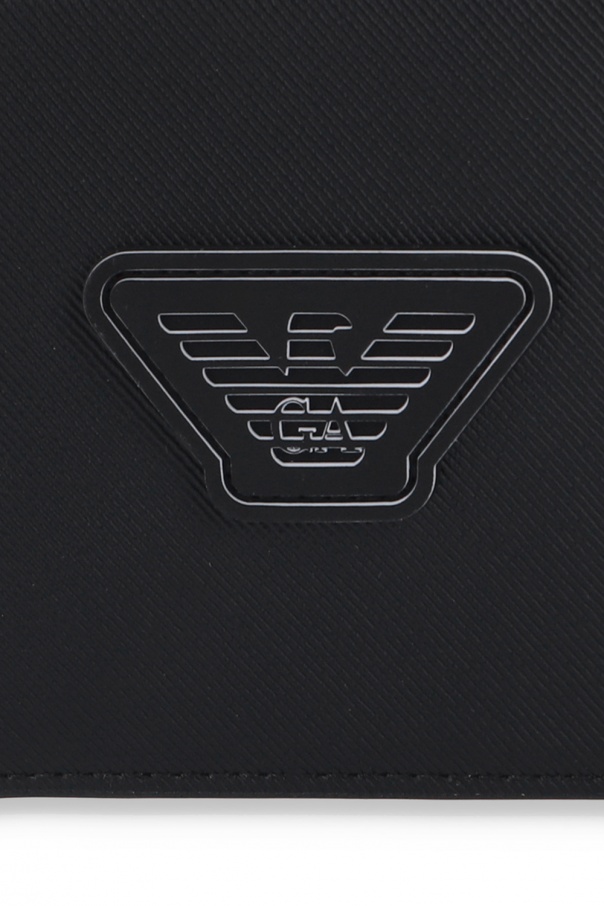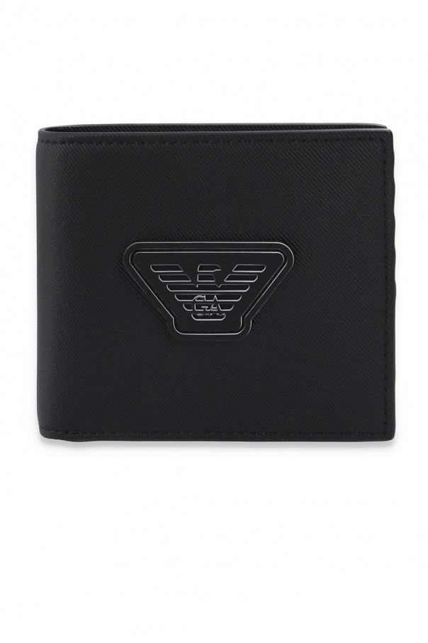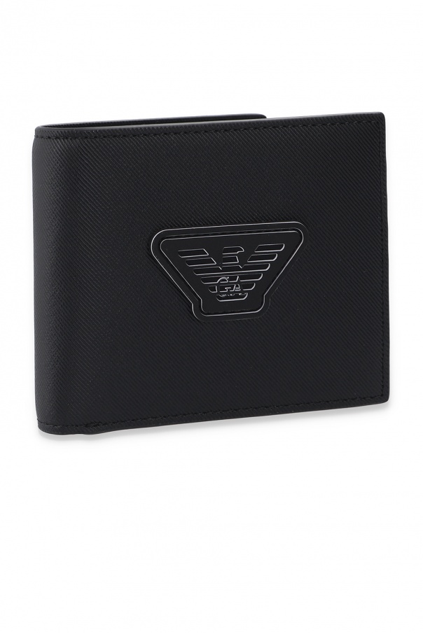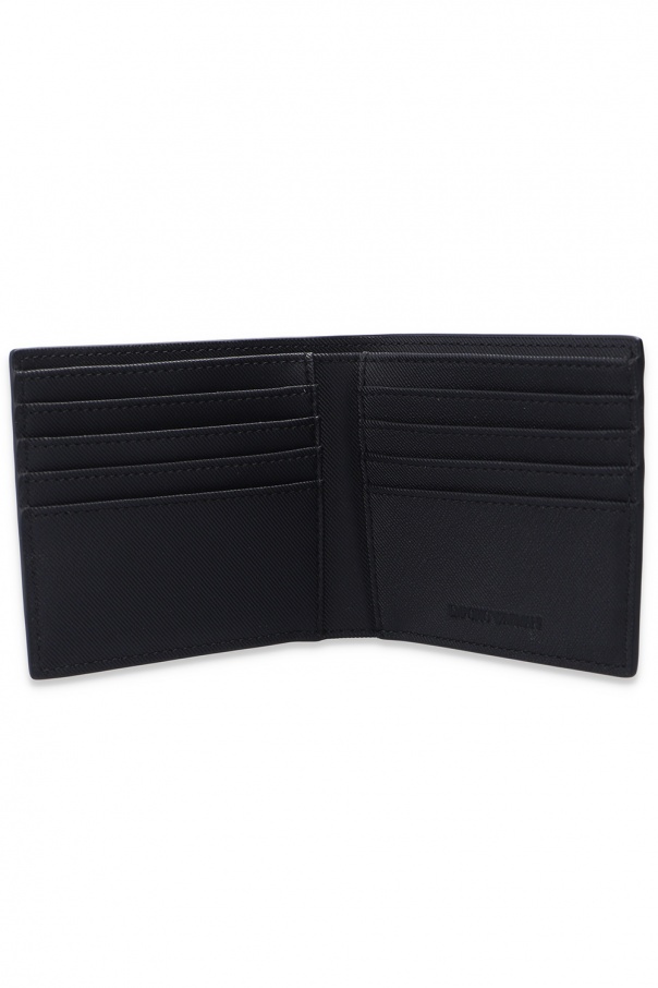 Black folding wallet from Emporio Armani. Embroidered with the brand's logo, this item features two bills compartments, two slip pockets and eight card slots.
