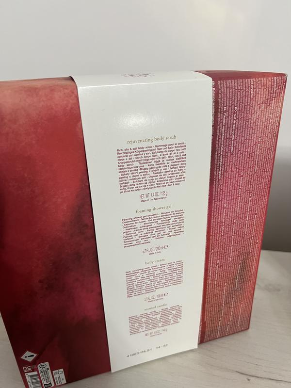 В составе набора: Гель-пена 200 мл, скраб для тела 125 мл, крем для тела 100 мл, ароматическая свеча 140 г.