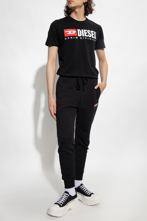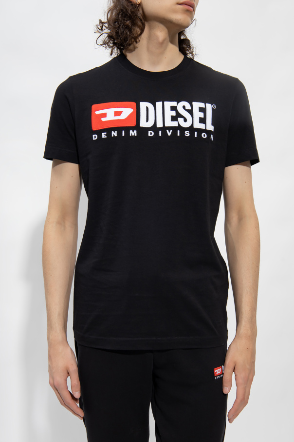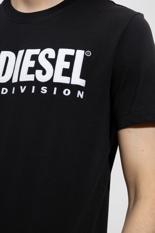 Black ‘T-DIEGOR-DIV’ crewneck T-shirt from Diesel. Crafted from cotton, this style features an elasticated collar, short sleeves and a logo patch for brand recognition.
