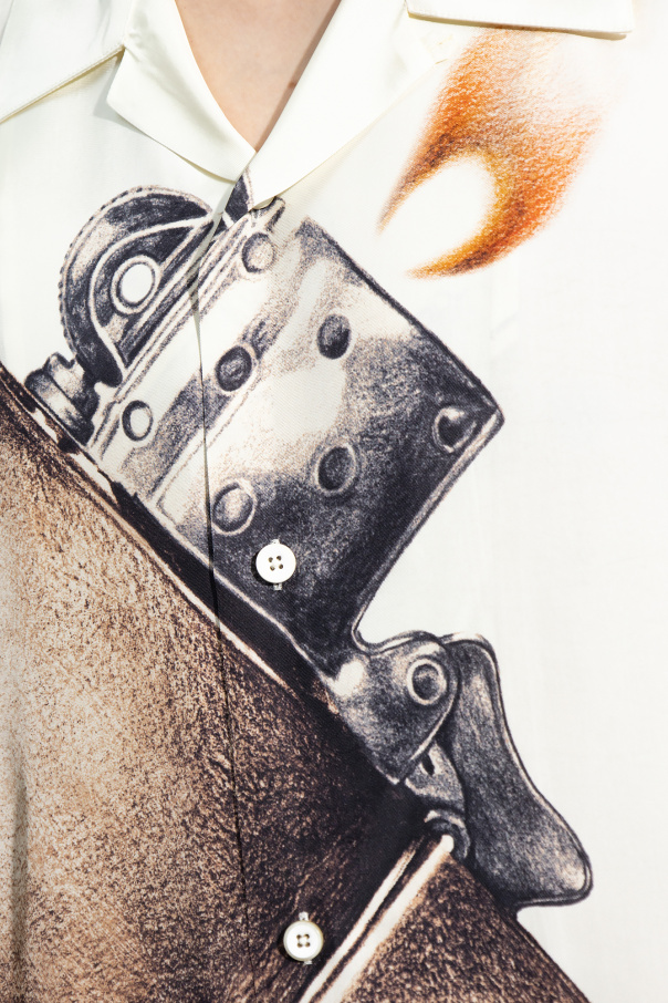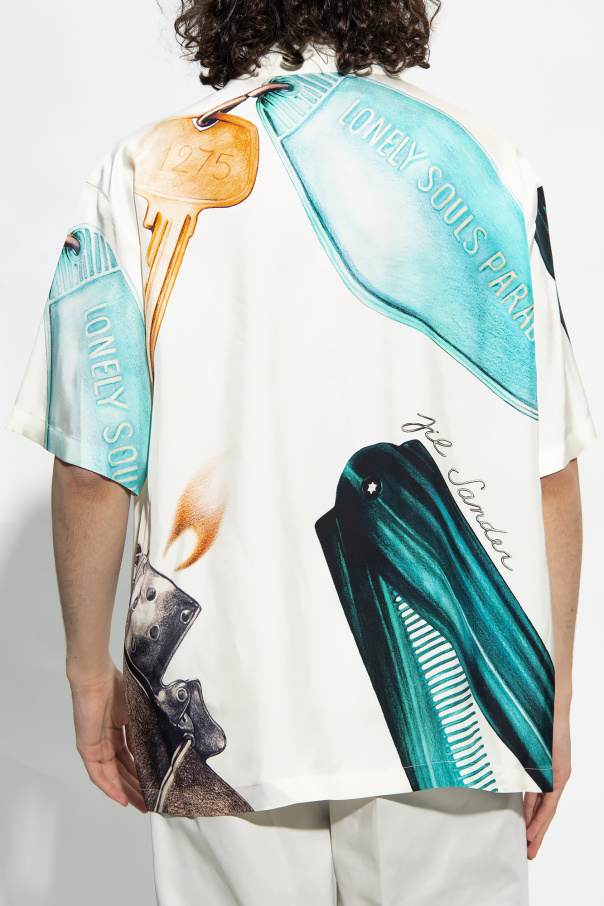 Cream shirt from Jil Sander. Spun from viscose with a relaxed, boxy fit, this style fastens with buttons and showcases a collared neckline, colourful graphic prints and short sleeves.