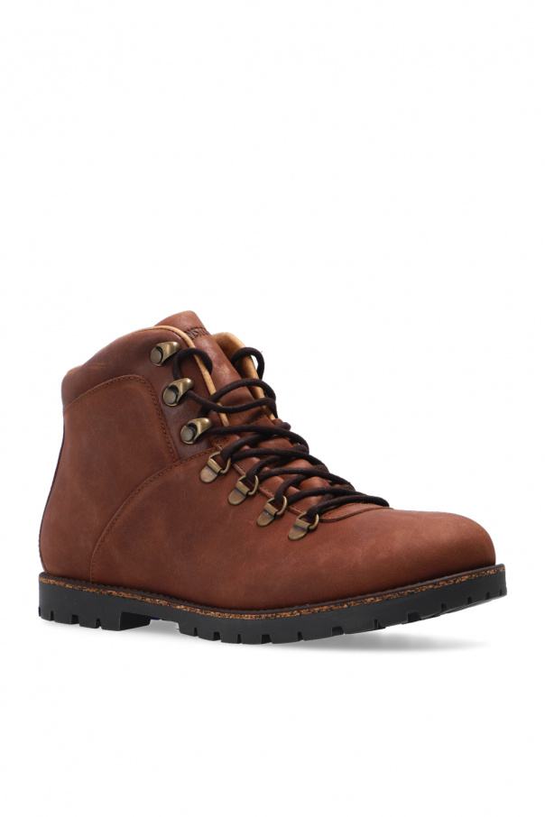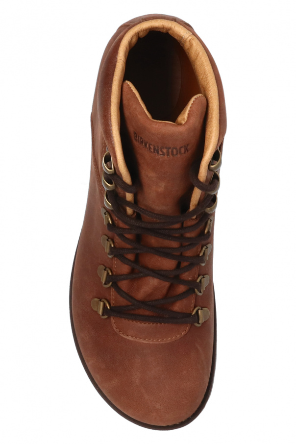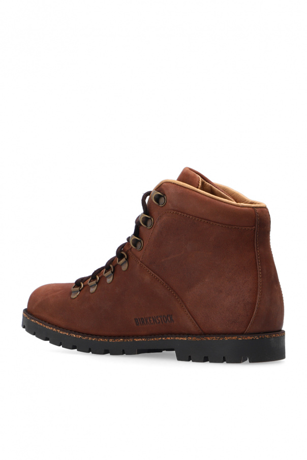 Brown ‘Jackson’ ankle boots from Birkenstock. Crafted from hydrophobic, oiled nubuck leather, this lace-up model sits on a dark brown anti-skidding rubber sole and features a logo-embossed tongue, a removable, anatomically-shaped inner sole in cork and latex and included swappable shoelaces.