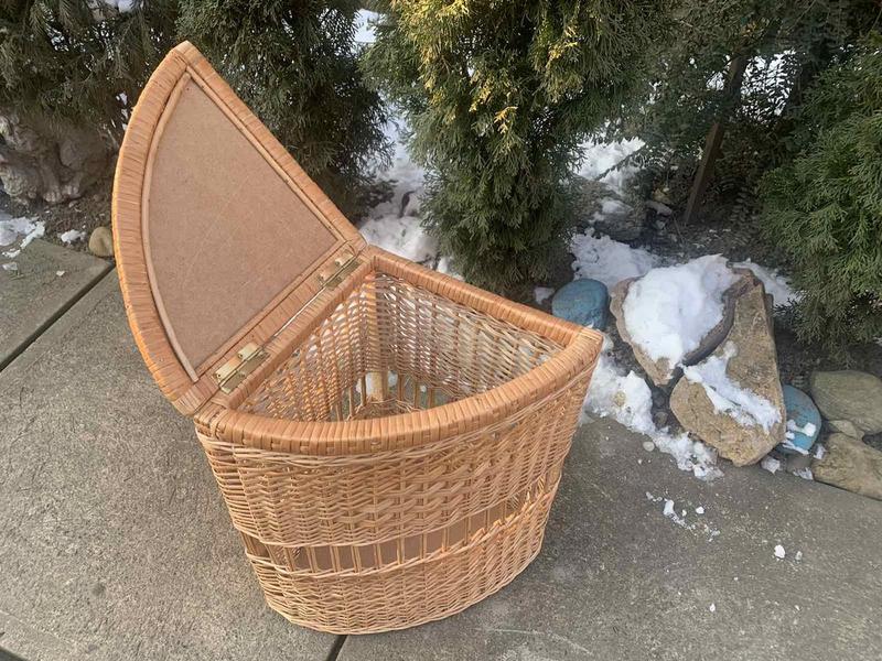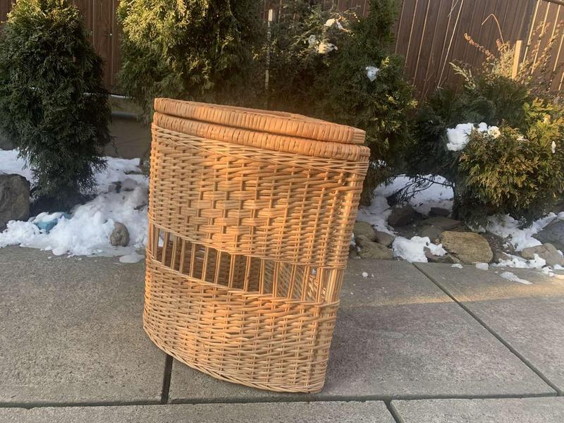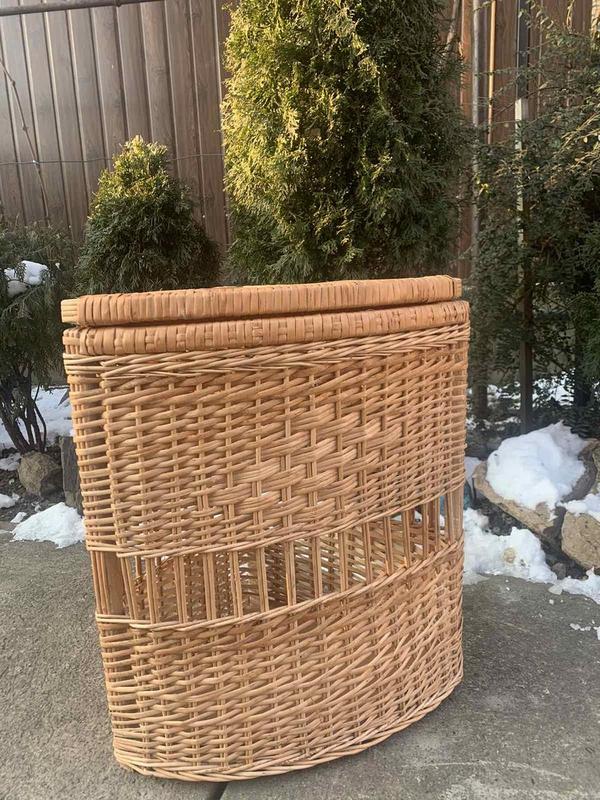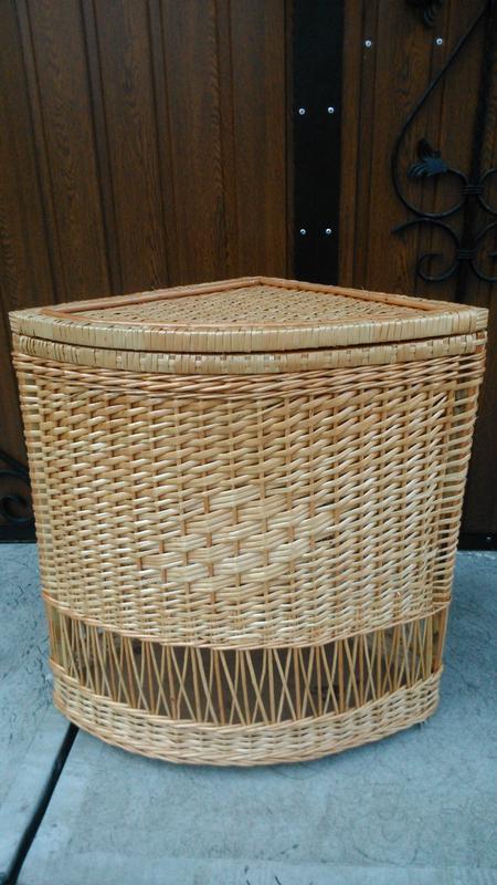 Ящик для белья из лозы угловой будет хорошо смотреться в ванной комнате. В