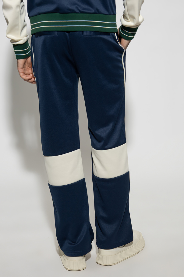 Navy and cream ‘Kola’ sweatpants from Wales Bonner. Made of a recycled fabric blend, this garment features an elastic drawstring waistband, green logo embroidery, two front pockets, two back pockets and straight legs.