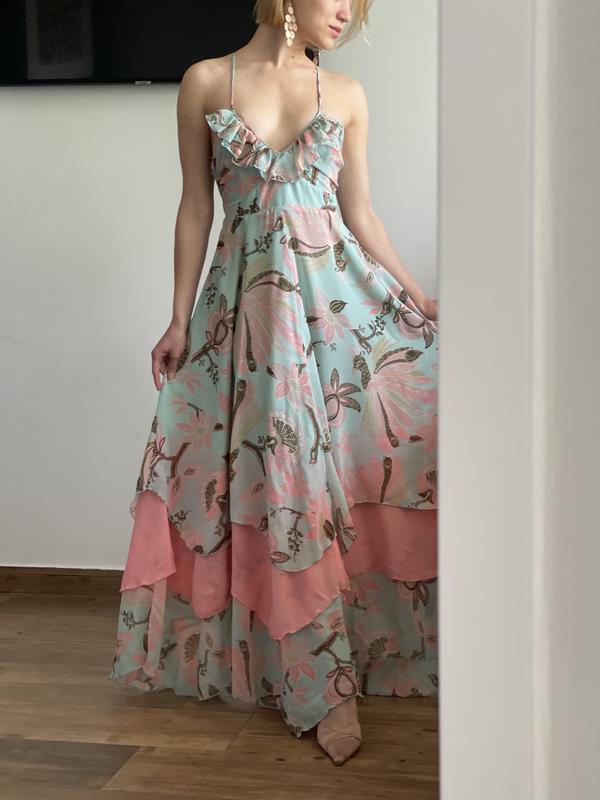 Платье сказочное!!!! На все случаи жизни, и к морю, и в ресторанчик, и в путешествие. Сложный крой юбки, многоярусный и каскадный, верх оформлен рюшами и фиксируется завязками, ну и комбинация оттенков ❤️и рисунка в виде жар птицы и цветов , не смотря, что платье из полиэстера, оно приятно к телу и не сильно мнётся