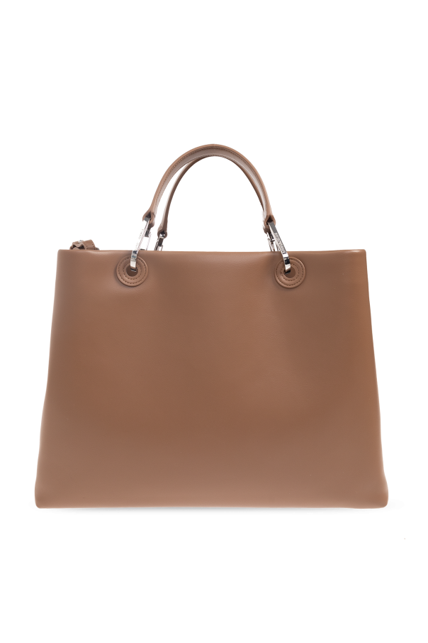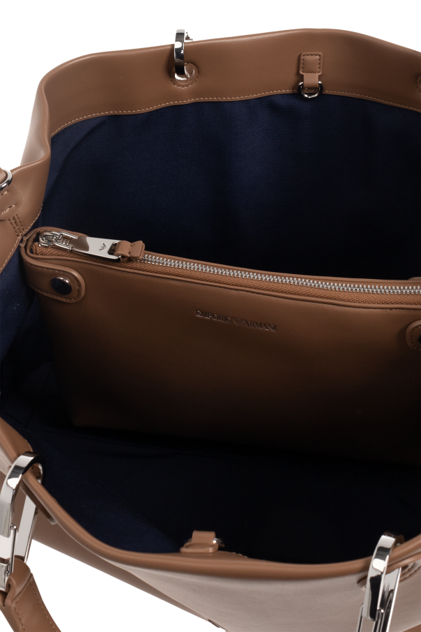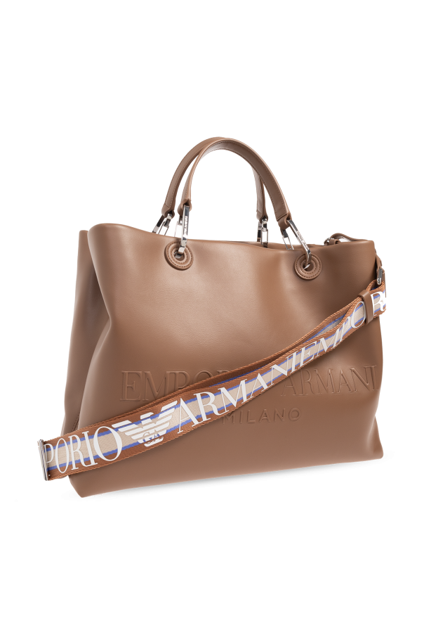 Brown shopper bag from Emporio Armani. Made from faux leather, this design fastens via a lobster clasp and showcases a tactile logo on the front, two half-round handles, silver-tone metal hardware as well as a detachable and adjustable multicoloured strap with a printed logo and one internal compartment with a removable zip pouch.