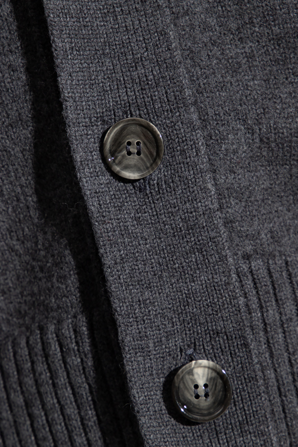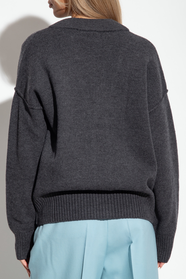 Grey cardigan from Ami Alexandre Mattiussi. Made from virgin wool, this style fastens with buttons and showcases the brand's ‘Ami de Coeur’ logo embroidered in red on the chest, long sleeves and ribbing on the V-neckline, bottom hem and cuffs.