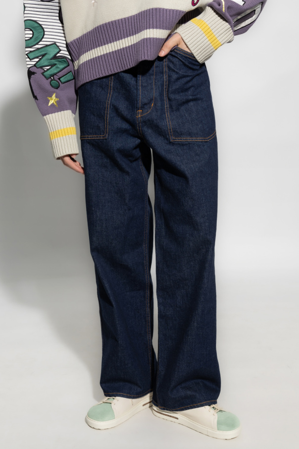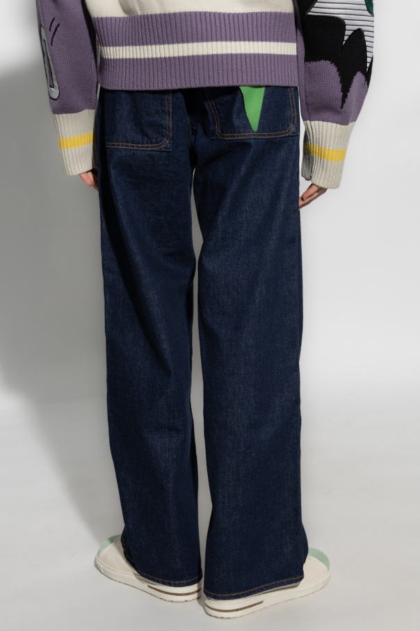 Navy jeans from Kenzo. Fastened with buttons, this wide leg pair features an adjustable buckle strap, beige stitching details, three front pockets and two back pockets with a green logo patch.