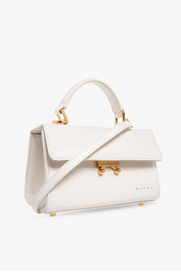 White ‘Relativity Mini’ shoulder bag from Marni. Crafted from calf leather, this design features a flap with a magnetic snap fastening, a printed gold-tone logo on the front, a half-round handle, a detachable and adjustable shoulder strap, gold-tone metal hardware and one internal compartment with a card slot.