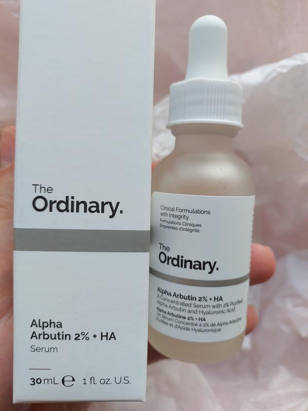 The Ordinary Alpha Arbutin 2% + HA сыворотка для осветления пигментных пятен Концентрированная сыворотка c Альфа Арбутином 2% и с гиалуроновой кислотой Объем: 30ml Alpha Arbutin 2% + HA - это концентрированная сыворотка с Альфа Арбутином и гиалуроновой кислотой, что обладает осветляющими и выравнивающими цвет кожи свойствами. Препарат ингибирует секрецию меланина, создавая равномерное распределение красителя. Содержание гиалуроновой кислоты эффективно увлажняет кожу, придавая ей мягкость и эластичность. РН косметики варьируется от 4,85 до 4,9. Не содержит спирт и силиконы. Продукт веганский, во время его производства ни одно животное не пострадало.