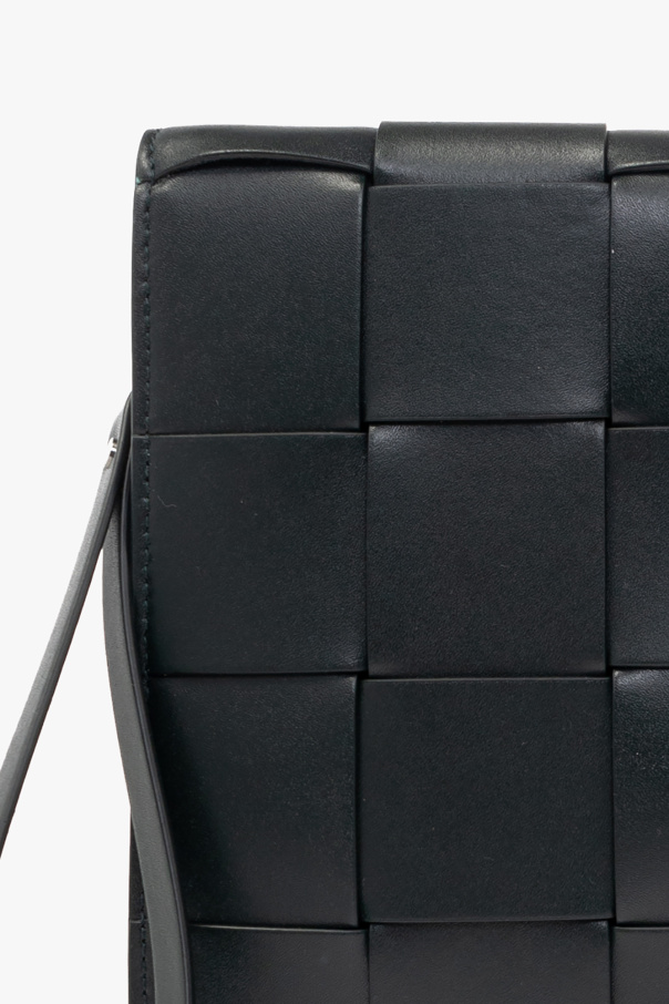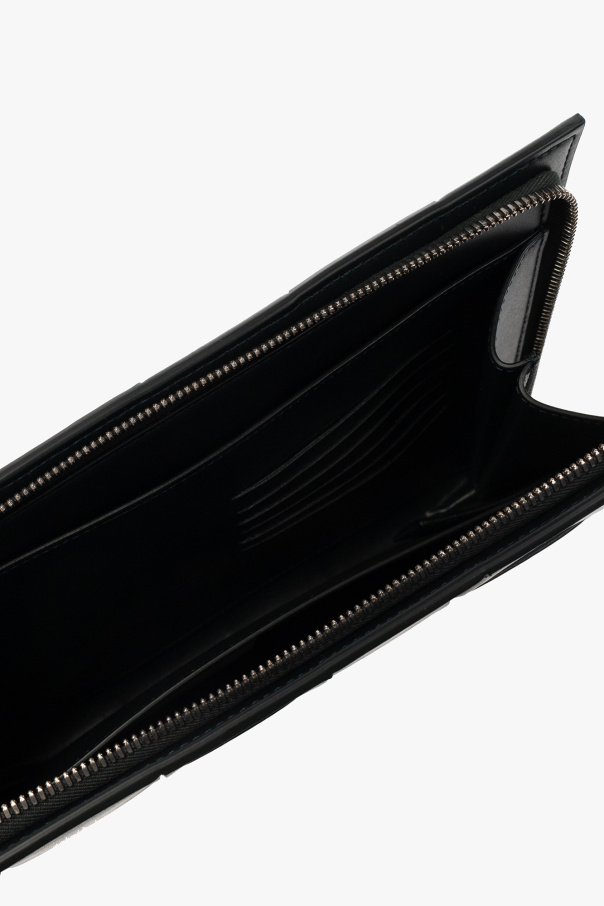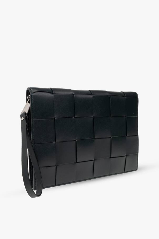 Dark green ‘Arco Medium’ document case from Bottega Veneta. Crafted from calf leather accentuated with the brand's signature ‘Intreccio’ weave, this design secures with a zip including a wrist strap and features silver-tone metal hardware and one internal compartment with two slip pockets and six card slots.