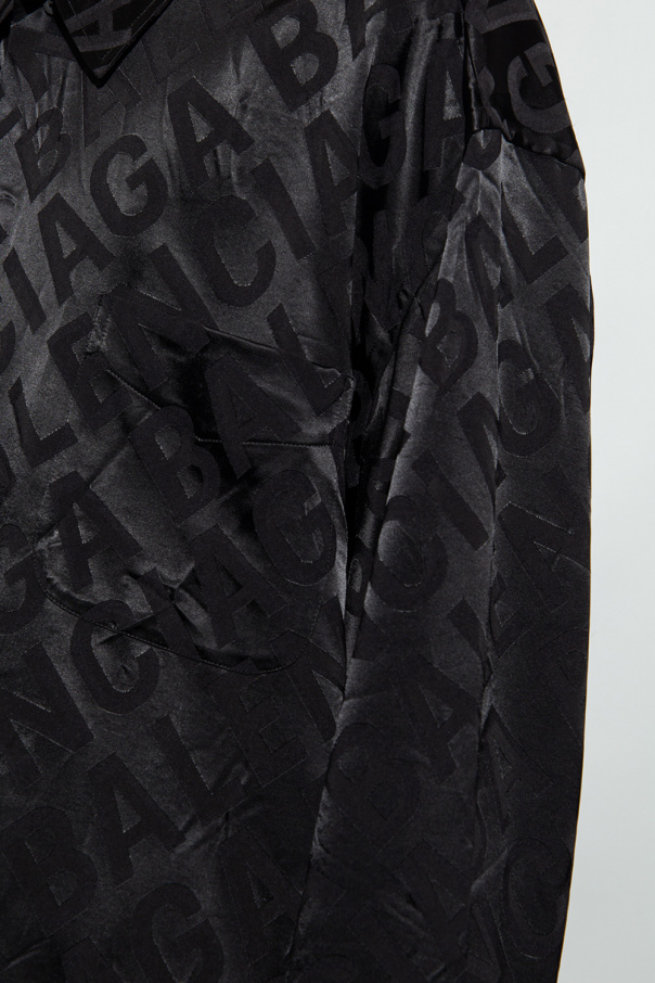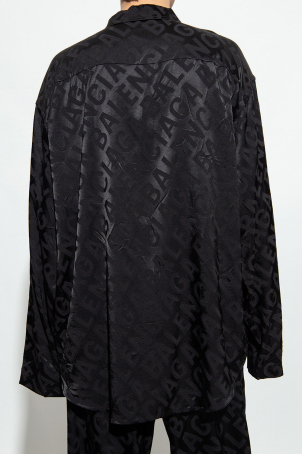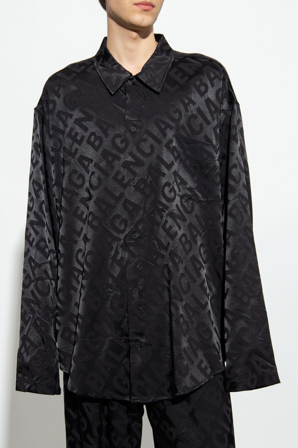 Black shirt from Balenciaga. Cut with an oversize silhouette, this style showcases a woven logo motif, button fastenings, a slip chest pocket and long sleeves.