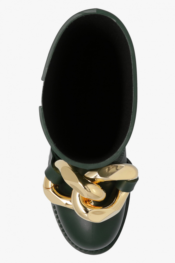 Dark green rain boots from JW Anderson. with an asymmetrical upper, this model sits on a dark green rubber sole and showcases gold-tone chain link hardware on the front.