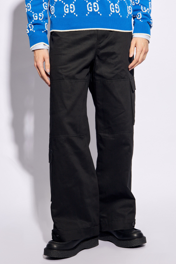 Black cargo trousers from Gucci. Made from cotton, this pair falls with wide legs and features a zip fly with hook & eye closures, two slip pockets, four flapped pockets and a black and white logo patch on the back.