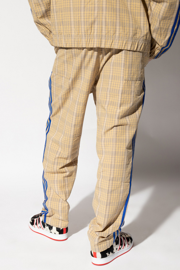 Yellow track pants from ADIDAS Originals. Made of cotton seersucker with an all-over check motif, this pair falls down with tapered legs and features a zip fly with a button, the signature three stripes in navy blue down the sides, an embroidered logo, two zipped pockets on the front and two welt pockets at the back.