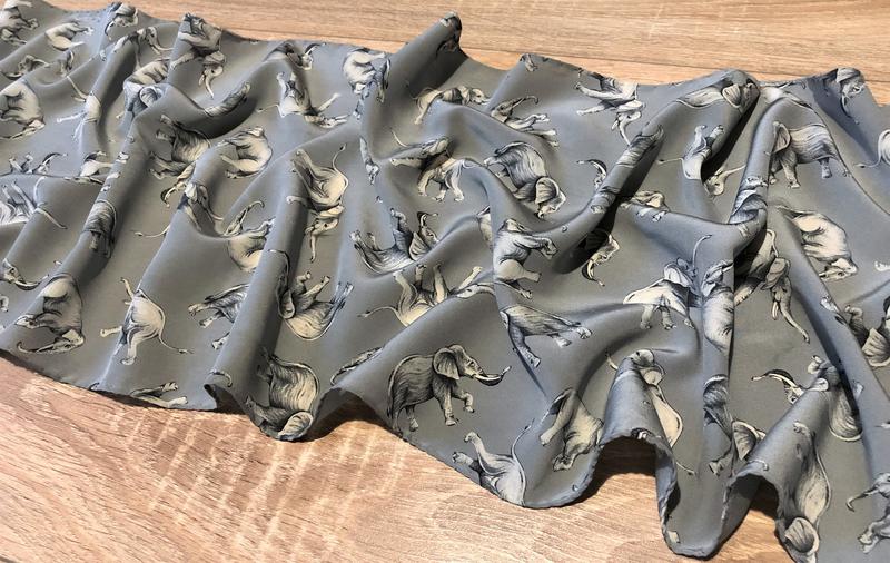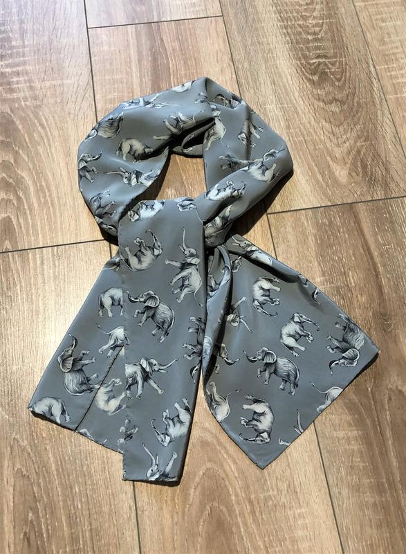 Шарф с принтом "слоники", изготовлен из 100% шелка, состояние очень хорошее, есть дефекты - пятна; без дыр и зацепов.
