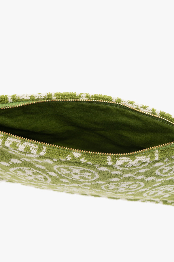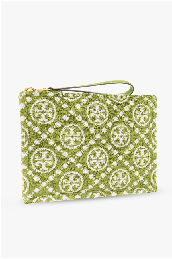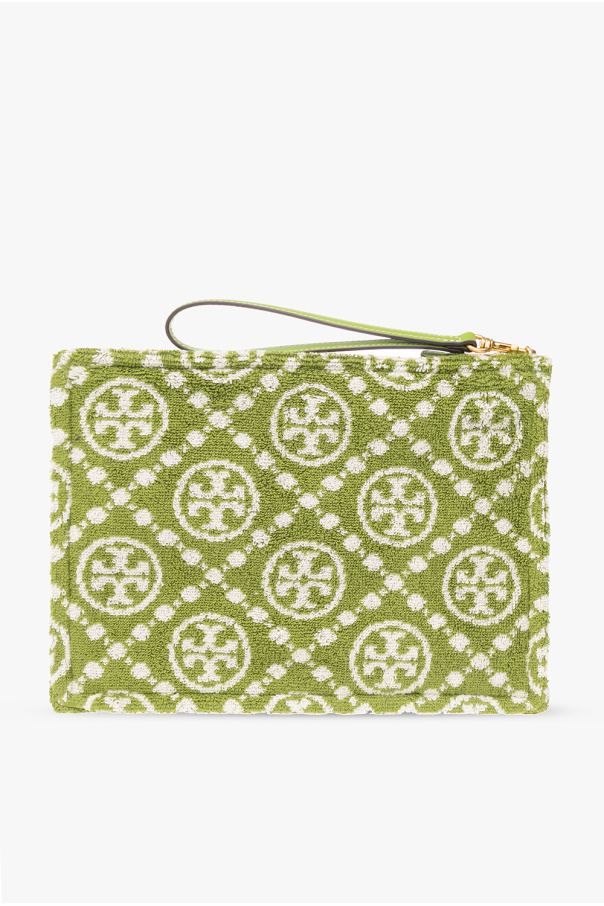 Green ‘Terry’ clutch from Tory Burch. Crafted from terry cotton, this design features a zip fastening, cream monogram pattern, detachable wrist strap to the side, one internal compartment and gold-tone metal hardware.