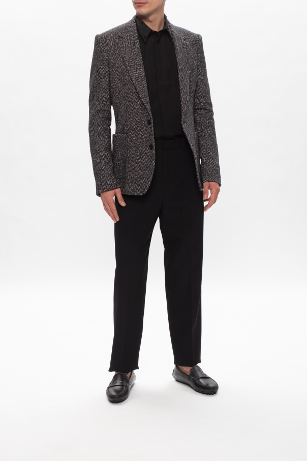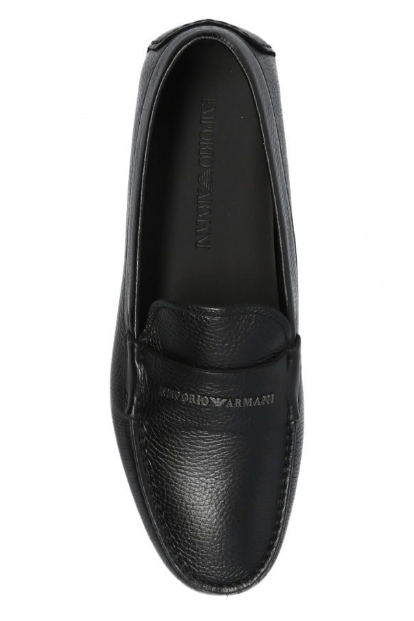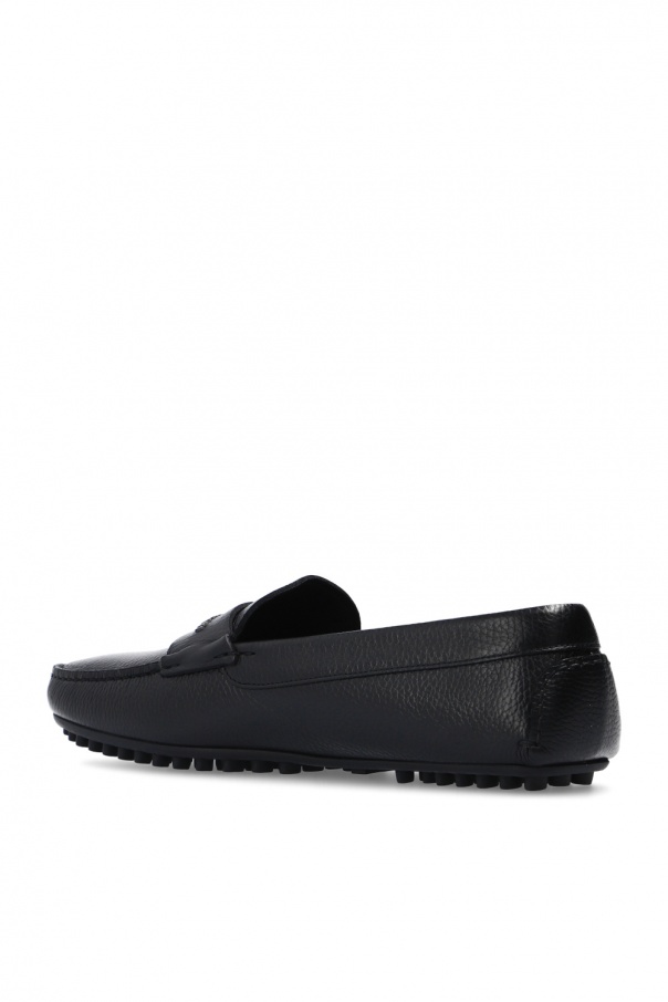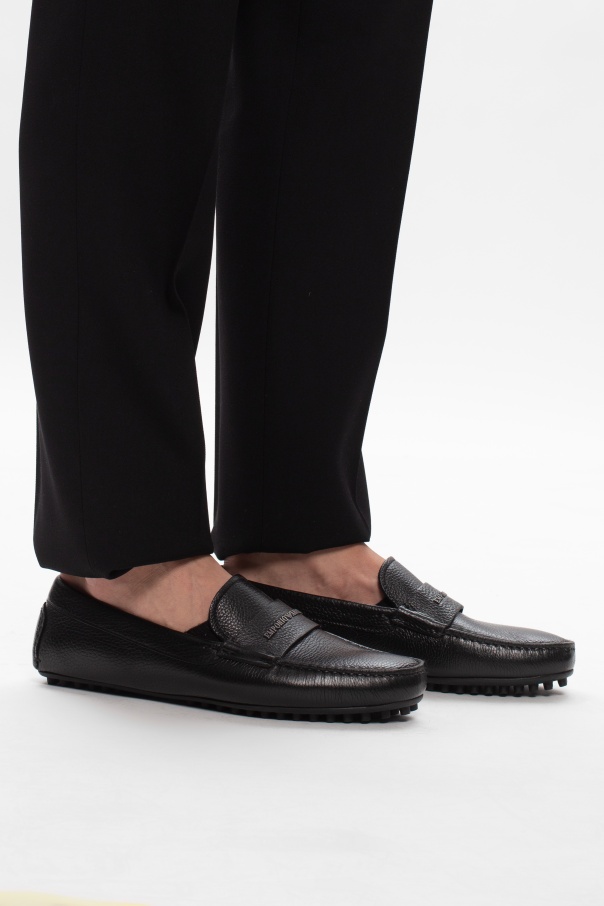 Black moccasins from Emporio Armani. Adorned with an antique silver-tone logo plaque on the vamp, this leather-crafted pair sits on a tonal black rubber sole.