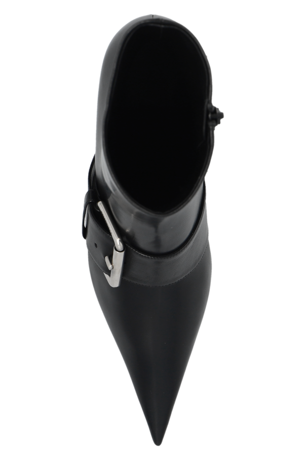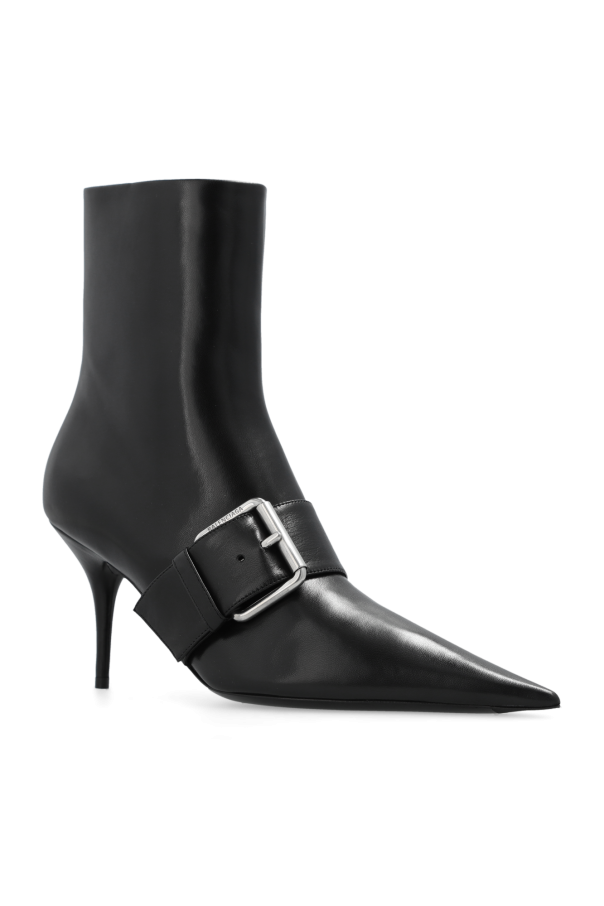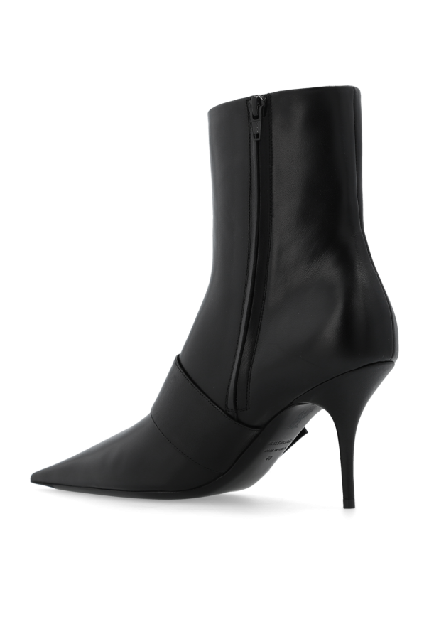 Black ‘Knife’ heeled ankle boots from Balenciaga. Made of leather with a pointed-toe silhouette, this model sits on a black leather sole and features a side zip and an adjustable strap with a logo on the front.