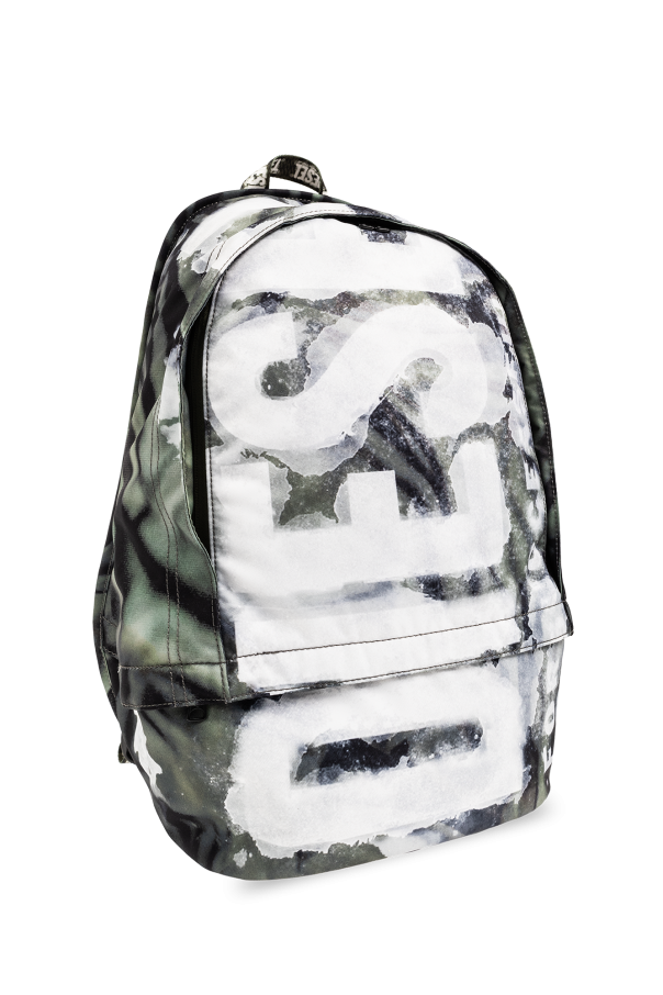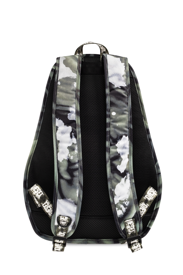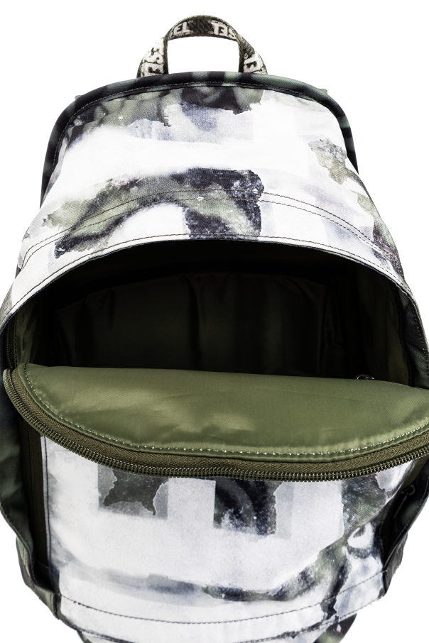 Green, black and beige ‘RAVE’ backpack from Diesel. Made of fabric, this design fastens via a two-way zip and showcases a grey and white graphic print with the brand's logo, one zip pocket on the front, one half-round handle, adjustable shoulder straps and one internal compartment with one zip pocket and one slip pocket which fits a 13’’ laptop.