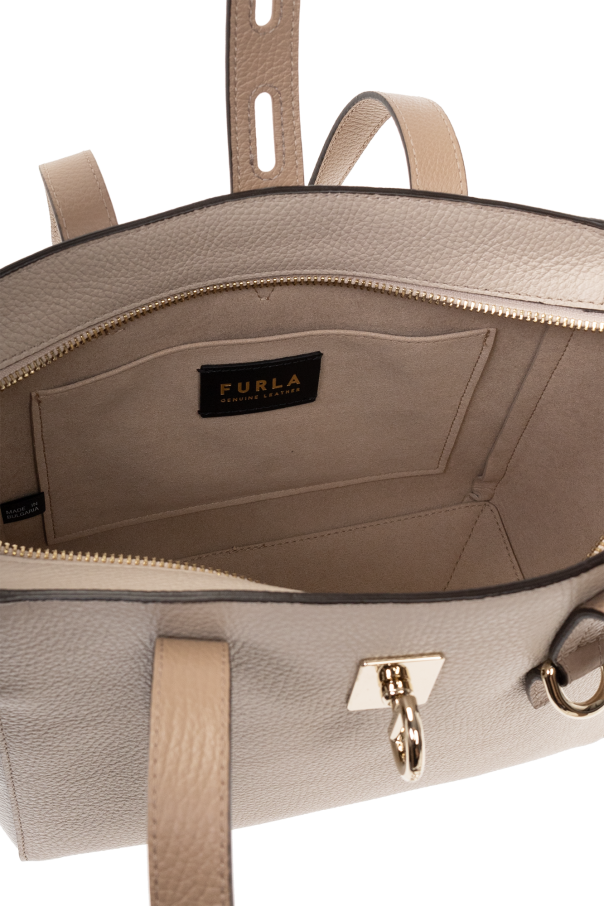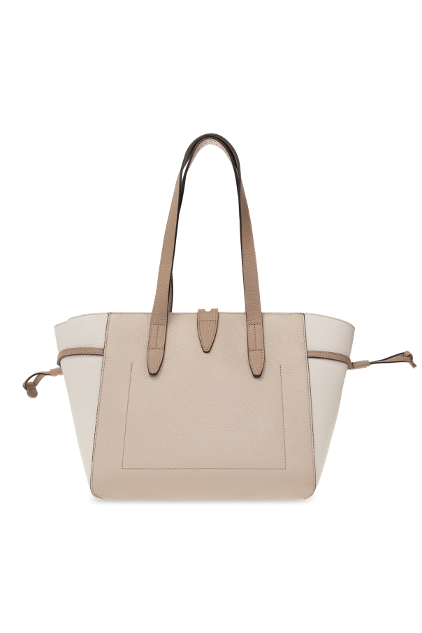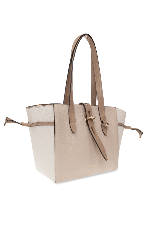 Beige and light grey ‘Net Small’ shopper bag from Furla. Crafted from leather, this design secures with a zipper and logo-engraved twist adjuster and features drawstring detailing on the sides, two half-round straps, gold-tone metal hardware and one internal compartment with a slip pocket.