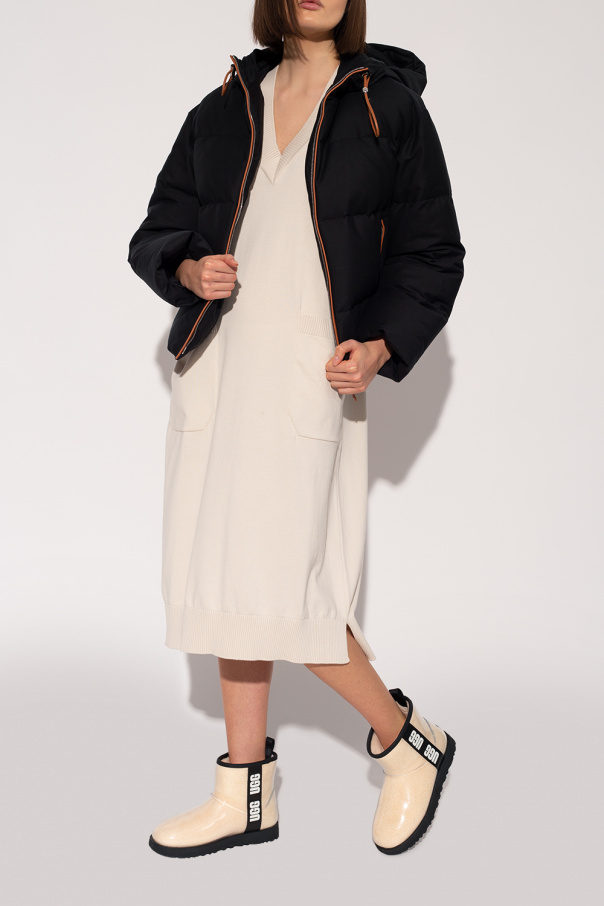 Cream and black ‘Classic Clear Mini’ snow boots from UGG. Boasting a high-top silhouette, this model features a transparent TPU molded upper, white and black logo detailing, UGGPlush™ wool-blend lining and a black rubber sole.