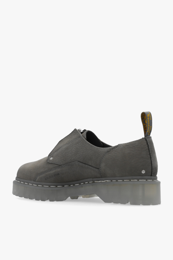 Grey ‘Bex’ shoes from A-COLD-WALL* x DR MARTENS. Made of suede, this model sits on a transparent light grey rubber sole and showcases a front zipper and the brand's logo.