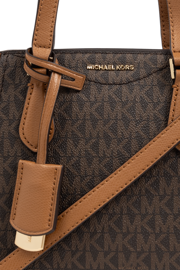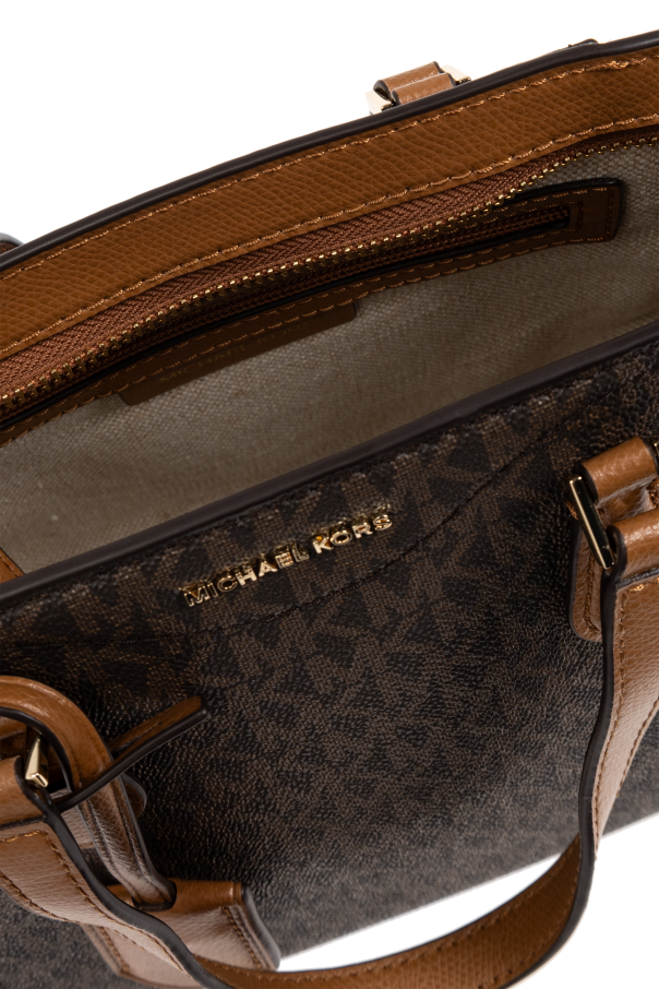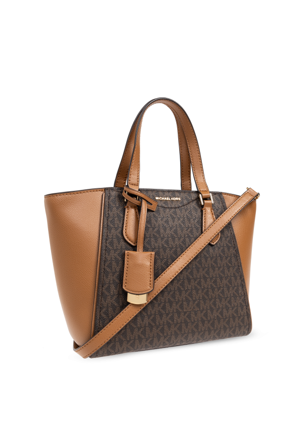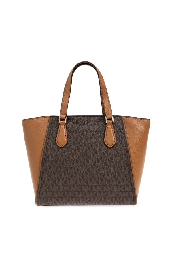 Introducing the exquisite Taryn Shoulder Bag from the illustrious collection of Michael Michael Kors. This luxurious trapezoidal accessory, crafted from premium leather, epitomizes sophistication and timeless elegance. The bag's exterior boasts the iconic "MK" logo pattern, meticulously repeated across its dark brown canvas, juxtaposed with lighter brown accents on the sides, handles, and adjustable shoulder strap. A prominent metal emblem of the designer's name, MICHAEL KORS, adorns the front, underscoring its exclusivity. Designed with practicality in mind, the Taryn features two short handles for hand carrying and a long, adjustable strap for shoulder wear. The spacious interior, lined with a light material, ensures effortless organization, while a secure zip closure keeps your belongings safe. An additional inside pocket with a zipper provides extra storage for smaller items. Why Choose This Product? Distinctive Design: Trapezoidal shape with the signature "MK" logo pattern. Premium Materials: High-quality leather and canvas exterior, and a 100% material interior. Versatile Carrying Options: Dual short handles and an adjustable shoulder strap. Secure and Spacious: Main compartment with a zipper closure and an additional interior zip pocket. Iconic Branding: Metal "MICHAEL KORS" logo and leather detail with a metal accent.