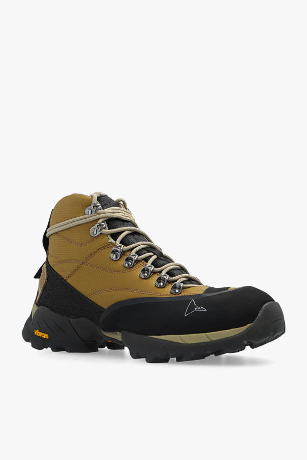 Beige, black and brown ‘Andreas’ hiking boots from Roa. Made of leather and fabric, this lace-up pair features a logo detail, rubber trims and black Vibram® Megagrip toothed tread pattern sole designed for optimal traction that ensures high resistance to use on roughest surfaces.