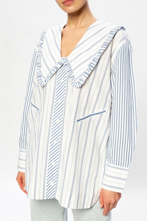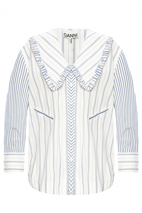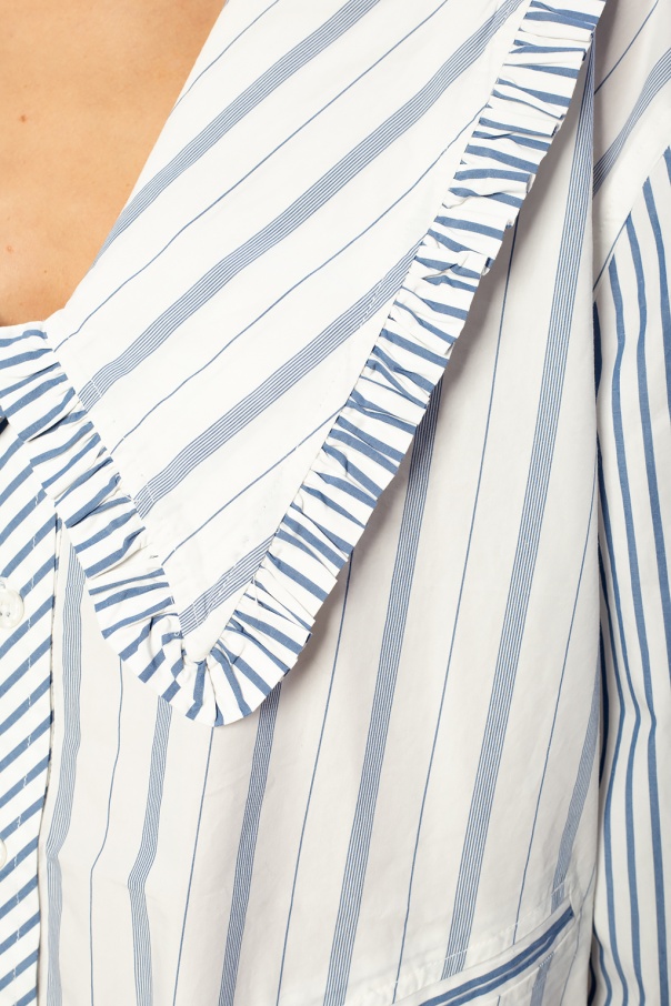 White and blue shirt from Ganni. Rendered in striped cotton boasting a relaxed silhouette, this style fastens via buttons and employs a distinctive V-shaped neckline accentuated with frills and long sleeves with button-fastened cuffs.