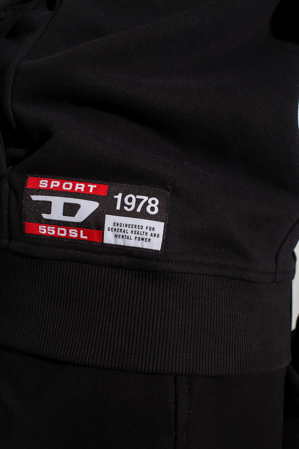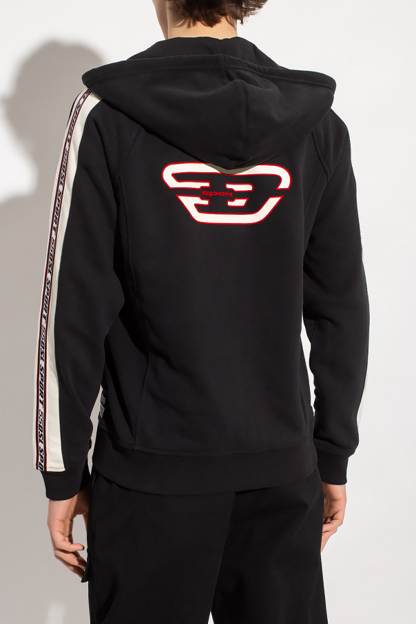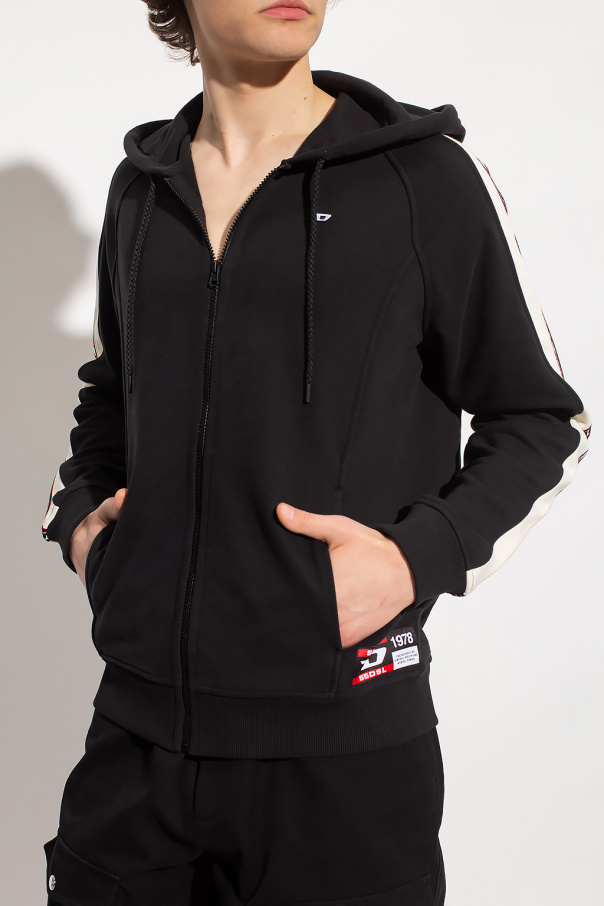 Black and cream ‘AMST-TRASTEER-HT01' hoodie from Diesel, the ‘Diesel Sport’ collection. Made of moisture-wicking fabric that stays dry, this design is complete with a zip fastening, drawstring hood, logo detail, two front pockets and ribbed trims at the hem and cuffs.