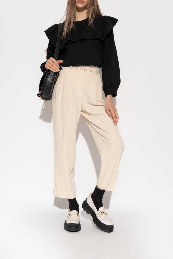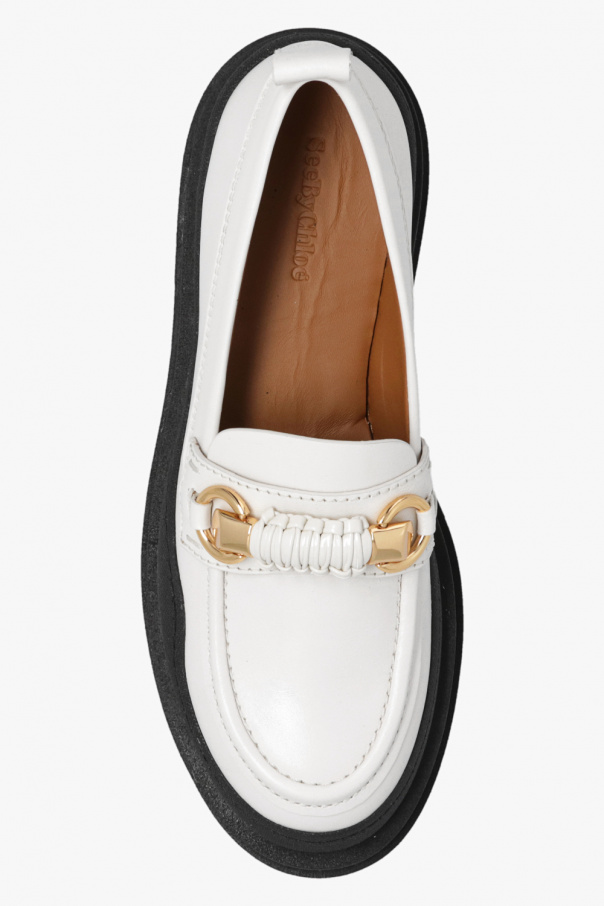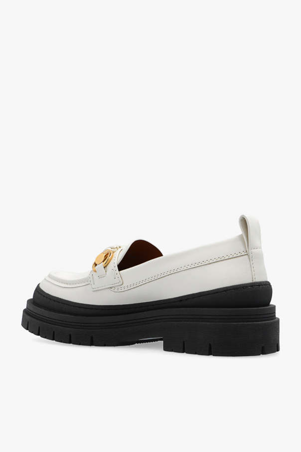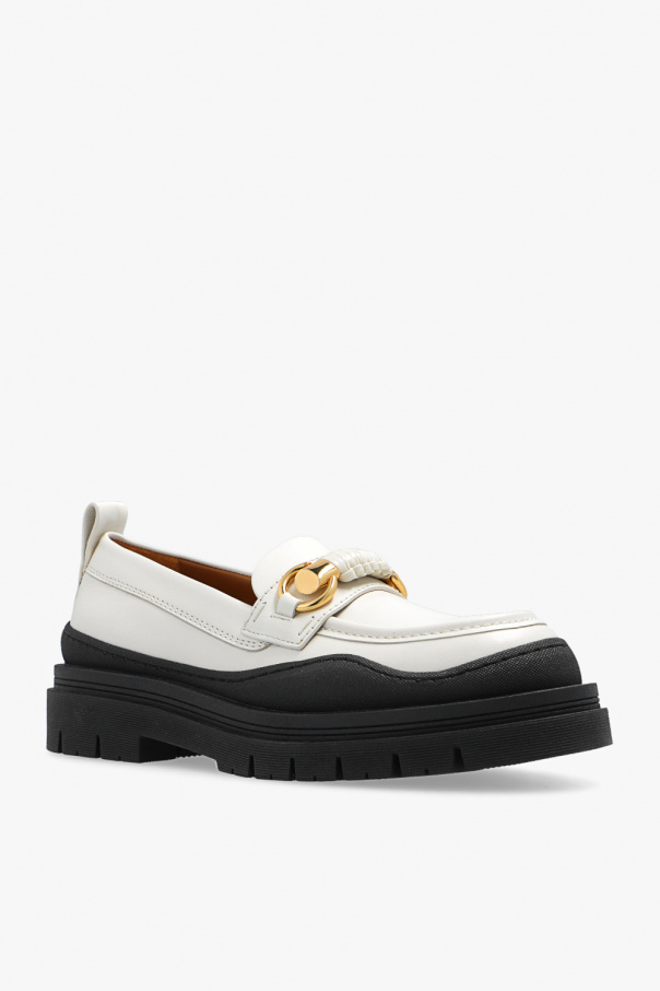 Cream and black ‘Lylia’ loafers from See By Chloe. Made from leather, this model sits on a black rubber sole and features distinctive stitching details and a gold-tone application on the front.