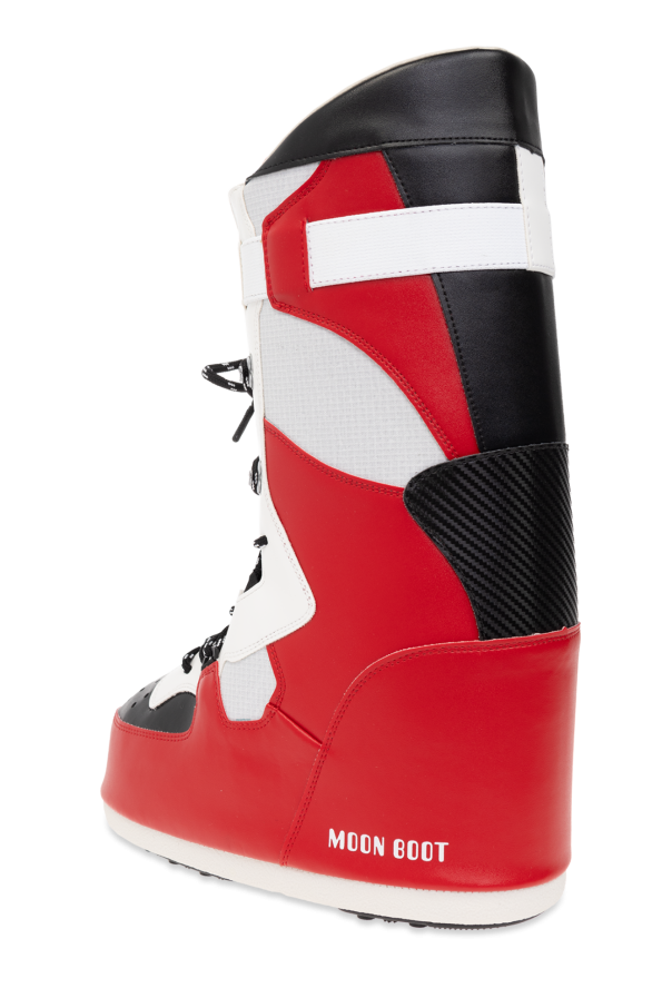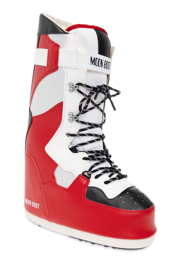 Red, white and black ‘Sneaker Hi’ snow boots from Moon Boot. Made of waterproof material, this lace-up model sits on a white and black tread rubber sole with suction cups to ensure superb grip on any surface and showcases a perforated front and logo detailing. This model is inspired by basketball style, while its oversized, insulated silhouette is reminiscent of the original 1969 design.