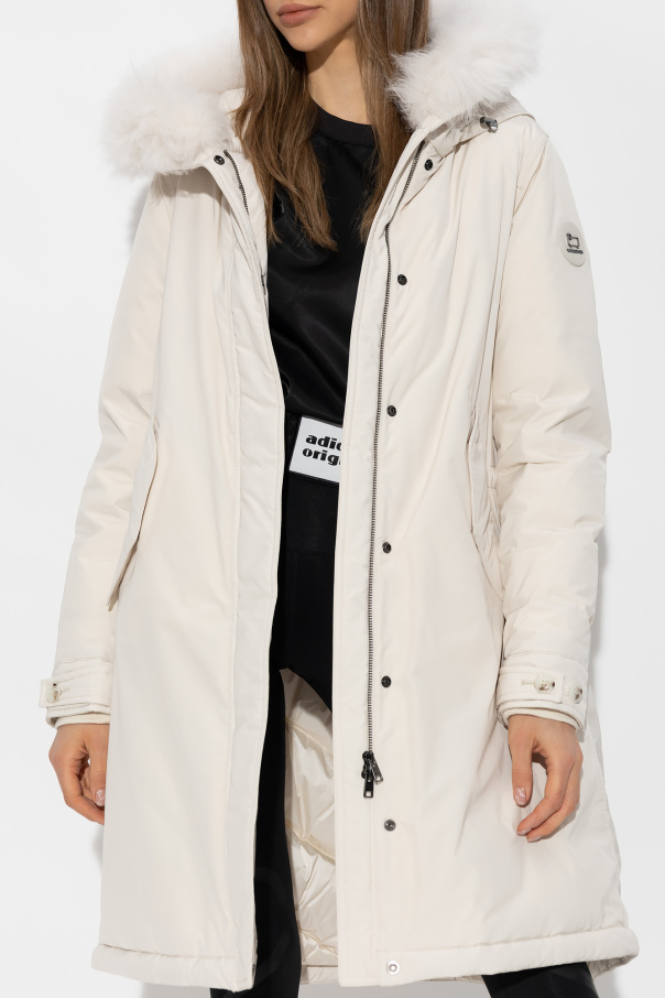 Cream down coat from Woolrich. Emblazoned with a logo patch, this style secures with a zipper and snaps and features a detachable hood, two flapped pockets, a drawcord-adjustable hem and long sleeves with elasticated cuffs.