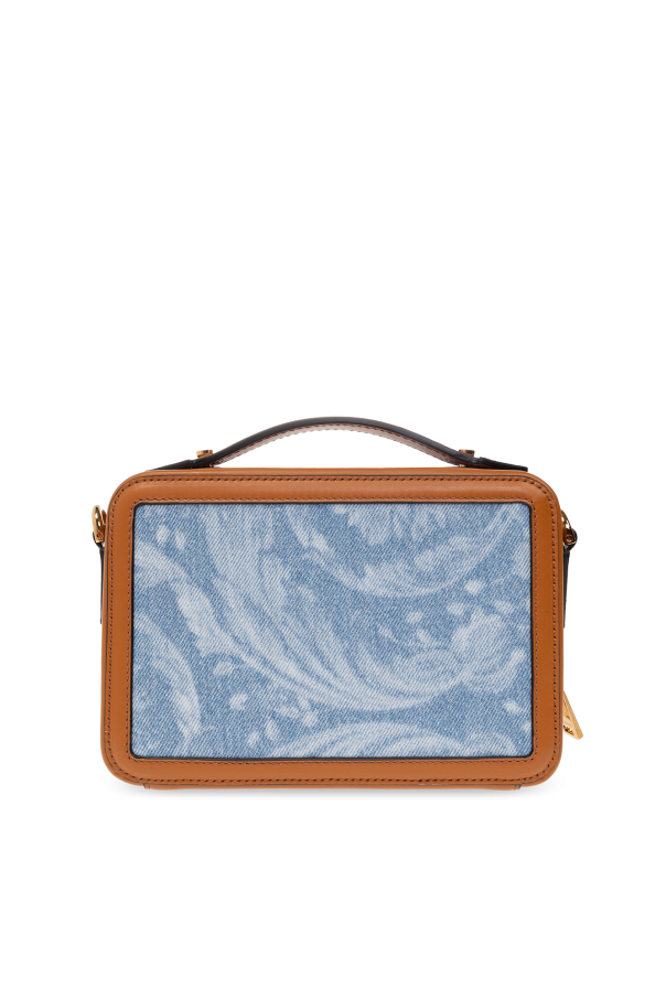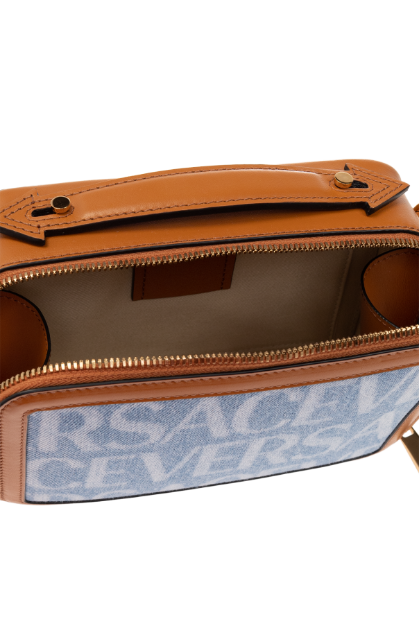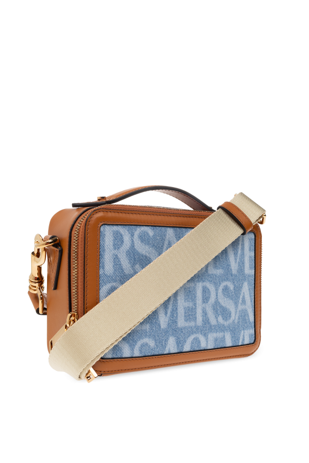 Blue shoulder bag from Versace. Rendered in denim and trimmed with brown calf leather, this design secures with a two-way zipper and features a logo pattern on the front and the brand's signature baroque motif at the back. It is complete with a detachable and adjustable beige shoulder strap, one half-round handle, gold-tone metal elements and one internal compartment with one slip pocket and four card slots.