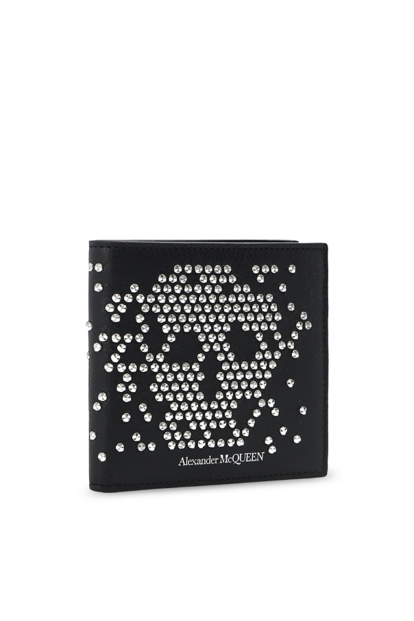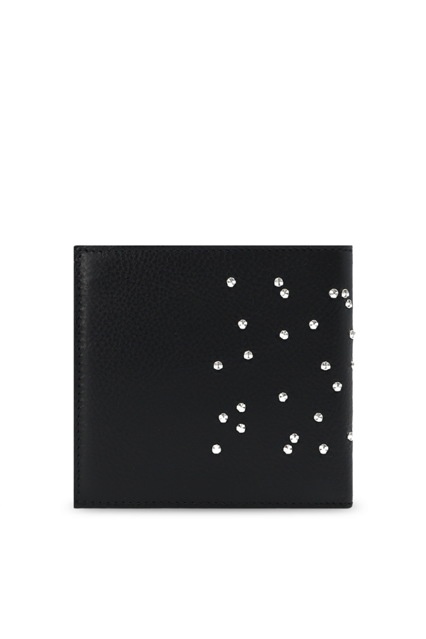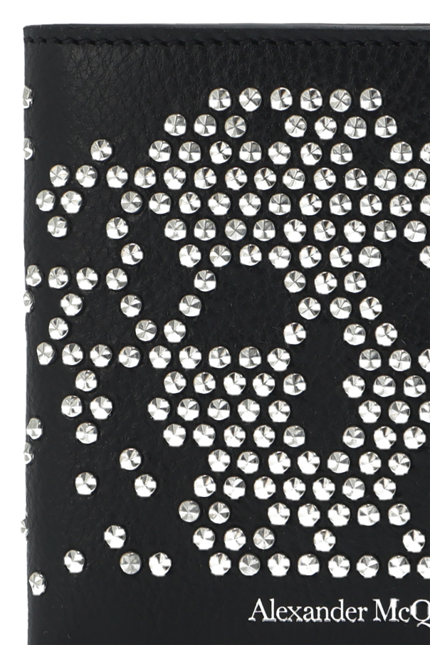 Black bifold wallet from Alexander McQueen. Crafted from calf leather, this model features a logo print and brass studs with the label’s signature skull motif. It has two bill compartments, two slip pockets and eight card slots inside.