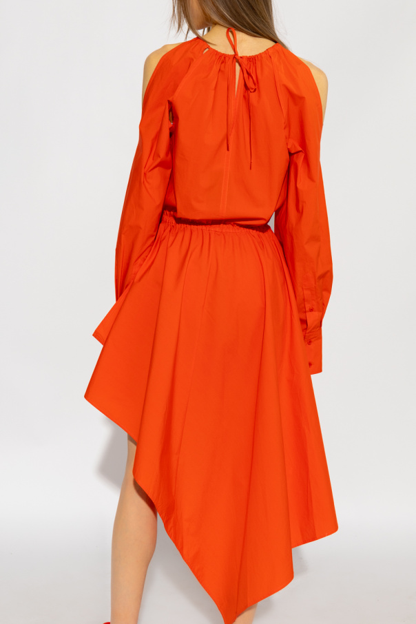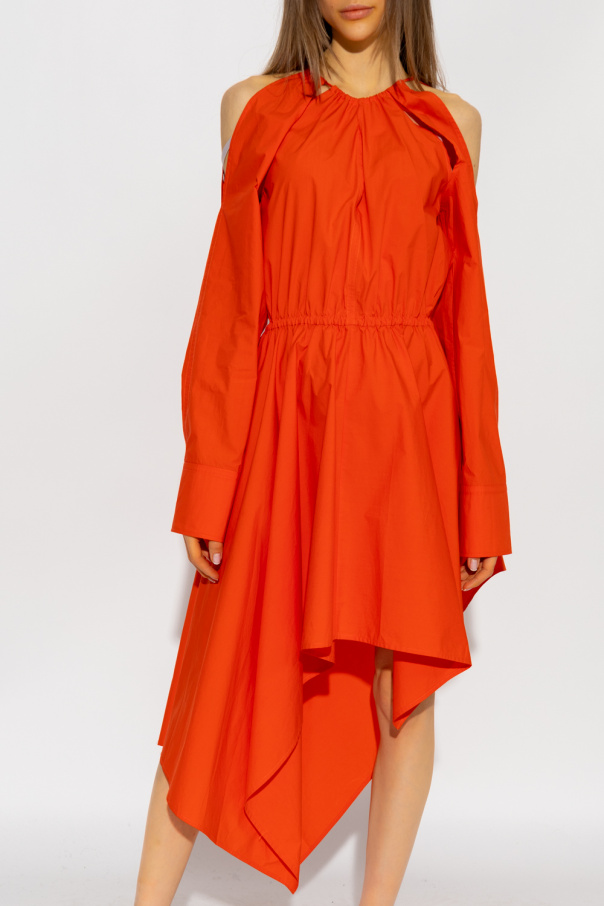 Red dress from JW Anderson. Made of cotton with an asymmetrical silhouette, this style features a drawstring closure at the neck, decorative cut-outs, an elastic trim at the waist and long sleeves with button cuffs – one has an embroidered logo.