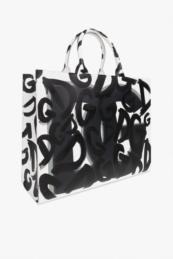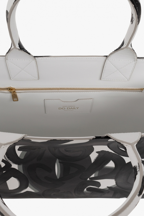 White and black ‘DG Daily Large’ shopper bag from Dolce & Gabbana. Crafted from calf leather, this design showcases a monogram pattern, two half-round handles, gold-tone metal hardware and one internal compartment with two slip pockets, one zip pocket and three card slots.