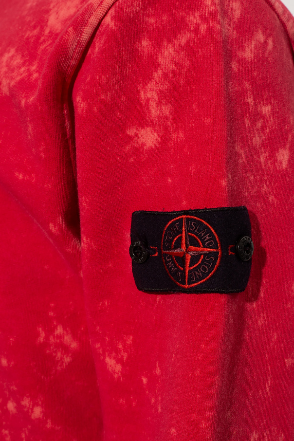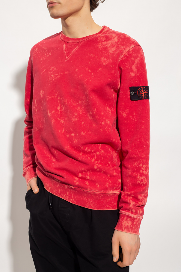 Red crewneck sweatshirt from Stone Island. Crafted from cotton jersey, this style showcases a paint splatter effect, a branded sleeve patch and ribbed trims on the collar, bottom hem and cuffs.