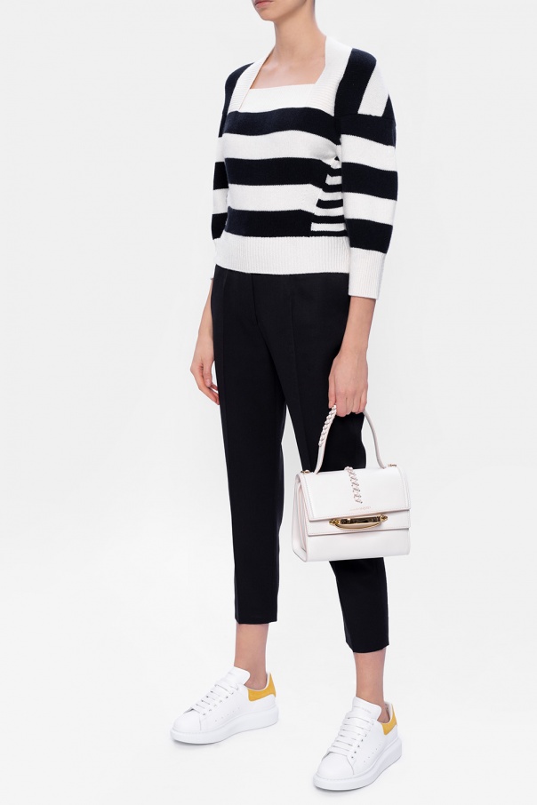 White and yellow ‘Larry’ sneakers from Alexander McQueen. Featuring leather and suede upper, this lace-up pair sits on a white rubber sole and showcases perforated details and silver-tone logo print for the brand recognition.