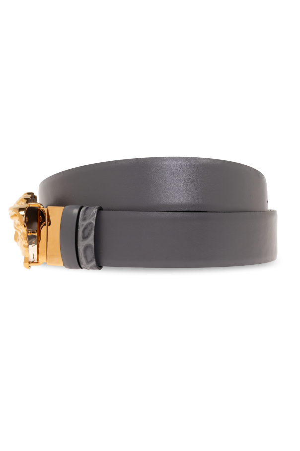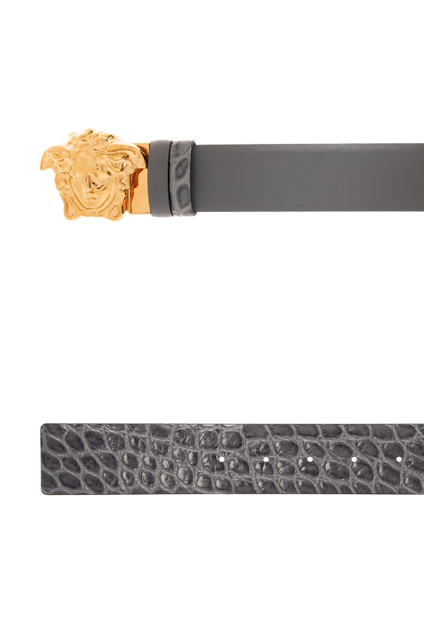 Dark grey belt with a double closure from Versace. Made of calf leather, this item features a gold-tone La Medusa buckle and lining embossed with a crocodile motif.