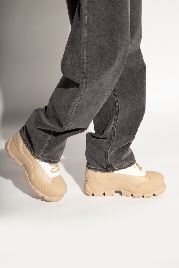 Cream and beige ‘Adiroam’ insulated boots from UGG. Made of waterproof suede and leather with UGGplush™ lining, this lace-up pair features an embossed logo, EVA foam midsole and cream Spider Rubber® outsole for enhanced traction. Equipped with 200g insulation and DryTech Technology. Weather rated -32C.