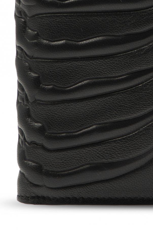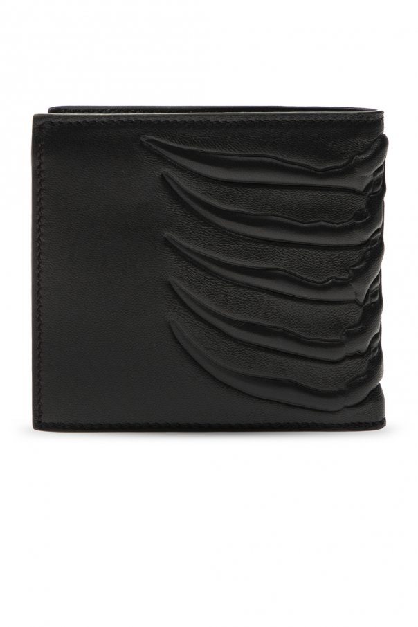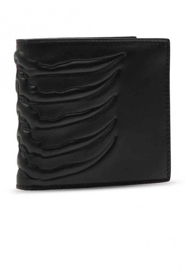 Black folding wallet from Alexander McQueen. Crafted from leather, this premium item comes embossed with a pattern and equipped with two bills compartments, two slip pockets and eight card slots inside.