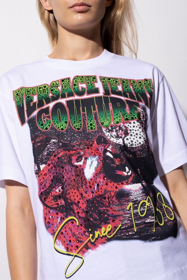White T-shirt with a multicolored logo pattern and appliqués from Versace Jeans Couture. Made of cotton.