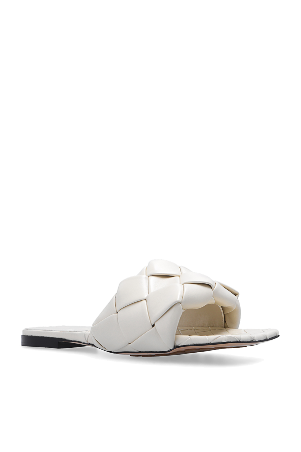 Cream ‘Lido’ slides from Bottega Veneta. Crafted from lamb leather with the Intreccio weave, this pair features a square toe, open toe and back as well as a beige and black rubber-injected leather outsole for increased stability.